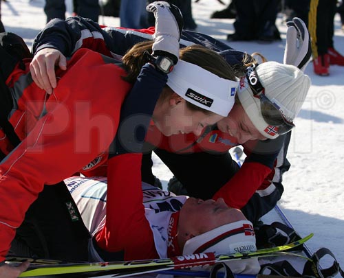 : Norwegian relay with members Marit Liland Fredriksen, Ingunn Weltzien, Marte Elden and Betty-Ann Bjerkreim Nilsen celebrating their gold medal in Junior Women FIS Nordic Junior Ski World Championships 4x3.3km relay race which was held in Medvode, Slovenia. Race was won by Norway, Sweden placed second, while Russia finished third.
