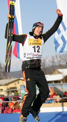 : Winner Tom Beetz of Germany celebrating his victory in Junior Nordic Combined sprint race of FIS Nordic Junior Ski World Championships which was held in Medvode, Slovenia on 5.February 2006.