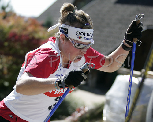 : Cross country skiers are competing during traditional roller ski race in Trzic, Slovenia. This years race was held on changed track which lead skiers from Trzic, Slovenia through villages Kovor and Hudo to finish line which was this year in Brezje pri Trzicu, Slovenia.