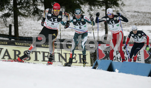 : Third placed Ronny Ackermann of Germany (L) leading group of skiiers (Anssi Koivuranta of Finland (2nd from L), Petter L. Tande of Norway (3rd from L and Maxime Laheurte of France (R)) during race of FIS Nordic Combined World Cup in Ramsau. FIS Nordic Combined World Cup was held in Ramsau am Dachstein, Austria, on 17th of December 2006.