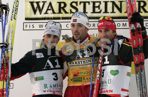: Winner Magnus-H. Moan of Norway (M), second placed Jason Lamy Chappuis of France (L) and third placed Ronny Ackermann of Germany (R) celebrating their medals after second race of FIS Nordic Combined World Cup in Ramsau. FIS Nordic Combined World Cup was held in Ramsau am Dachstein, Austria, on 17th of December 2006.