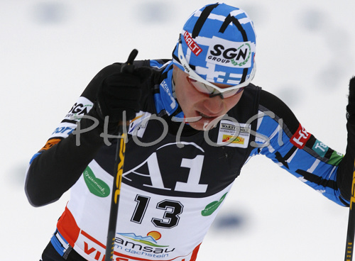 : Janne Ryynaenen of Finland skiing during cross country section of Nordic Combined World Cup. Nordic combined World Cup was held in Ramsau, Austria on 15th of December 2007.