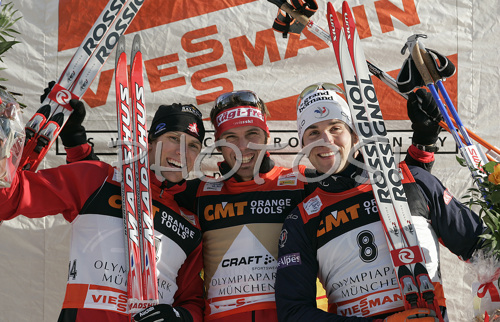 : Christoph Eigenmann of Switzerland (M), Devon Kershaw of Canada (L) and Roddy Darragon of France (R) celebrate their medals in first race of FIS Viessmann Tour de Ski. Men sprint race in Munich, Germany was, after cancelation of races in Nove Mesto, Czech, first race of FIS Viessmann Tour de Ski and was held in Olympic stadium in Munich, Germany on 31st of December 2006.