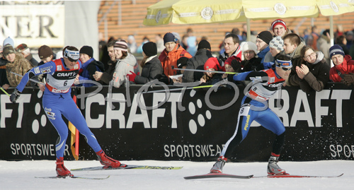Munich ,Germany - 31.12.2006 : Aino Kaisa Saarinen of Finland (R) and Petra Majdic of Slovenia (L) skiing in finals of first race of FIS Viessmann Tour de Ski. Women sprint race in Munich, Germany was, after cancelation of races in Nove Mesto, Czech, first race of FIS Viessmann Tour de Ski and was held in Olympic stadium in Munich, Germany on 31st of December 2006. Photo by: Primoz Jeroncic/PhotoSI