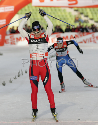 : Marit Bjoergen of Norway celebrating her victory in finals of first race of FIS Viessmann Tour de Ski. Women sprint race in Munich, Germany was, after cancelation of races in Nove Mesto, Czech, first race of FIS Viessmann Tour de Ski and was held in Olympic stadium in Munich, Germany on 31st of December 2006.