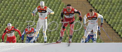 : Christoph Eigenmann of Switzerland leading quarter finals group in first race of FIS Viessmann Tour de Ski. Men sprint race in Munich, Germany was, after cancelation of races in Nove Mesto, Czech, first race of FIS Viessmann Tour de Ski and was held in Olympic stadium in Munich, Germany on 31st of December 2006.