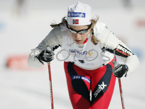: Astrid Jacobsen of Norway skiing in qualifications for Women Sprint race of Junior Nordic skiing World Championships in Tarvisio, Italy. Qualifications for Women Sprint race of Junior Nordic skiing World Championships in Tarvisio, Italy were held on 12th of March 2007 in Fusine, Italy. Due warm weather and lack of snow, cross country skiing races of Junior Nordic skiing World Championships 2007 were moved from Tarvisio, Italy to Fusine, Italy.