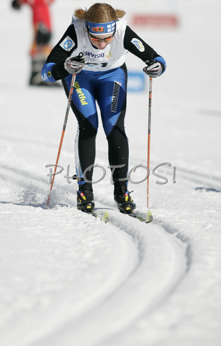 : Satu Annila of Finland skiing in qualifications for Women Sprint race of Junior Nordic skiing World Championships in Tarvisio, Italy. Qualifications for Women Sprint race of Junior Nordic skiing World Championships in Tarvisio, Italy were held on 12th of March 2007 in Fusine, Italy. Due warm weather and lack of snow, cross country skiing races of Junior Nordic skiing World Championships 2007 were moved from Tarvisio, Italy to Fusine, Italy.