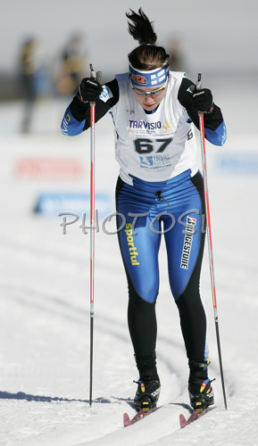 : Tiina Taskinen of Finland skiing in qualifications for Women Sprint race of Junior Nordic skiing World Championships in Tarvisio, Italy. Qualifications for Women Sprint race of Junior Nordic skiing World Championships in Tarvisio, Italy were held on 12th of March 2007 in Fusine, Italy. Due warm weather and lack of snow, cross country skiing races of Junior Nordic skiing World Championships 2007 were moved from Tarvisio, Italy to Fusine, Italy.