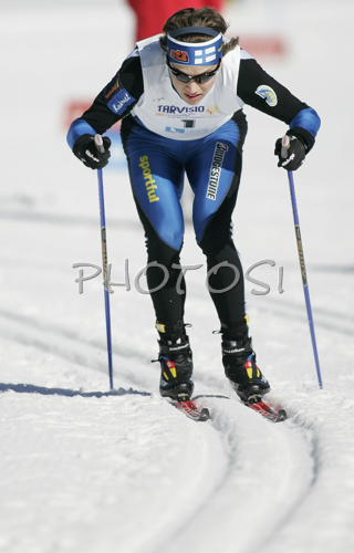 : Martti Jylhae of Finland skiing in qualifications for Men Sprint race of Junior Nordic skiing World Championships in Tarvisio, Italy. Qualifications for Men Sprint race of Junior Nordic skiing World Championships in Tarvisio, Italy were held on 12th of March 2007 in Fusine, Italy. Due warm weather and lack of snow, cross country skiing races of Junior Nordic skiing World Championships 2007 were moved from Tarvisio, Italy to Fusine, Italy.