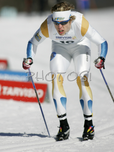 : Adam Johansson of Sweden skiing in qualifications for Men Sprint race of Junior Nordic skiing World Championships in Tarvisio, Italy. Qualifications for Men Sprint race of Junior Nordic skiing World Championships in Tarvisio, Italy were held on 12th of March 2007 in Fusine, Italy. Due warm weather and lack of snow, cross country skiing races of Junior Nordic skiing World Championships 2007 were moved from Tarvisio, Italy to Fusine, Italy.