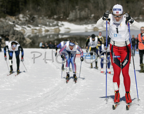 : Winner Astrid Jacobsen of Norway skiing in finals of Women Sprint race of Junior Nordic skiing World Championships in Tarvisio, Italy. Women Sprint race of Junior Nordic skiing World Championships in Tarvisio, Italy was held on 12th of March 2007 in Fusine, Italy. Due warm weather and lack of snow, cross country skiing races of Junior Nordic skiing World Championships 2007 were moved from Tarvisio, Italy to Fusine, Italy.