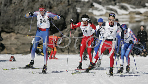 : Third placed Eirik Saeves of Norway skiing in quarter finals of Men Sprint race of Junior Nordic skiing World Championships in Tarvisio, Italy. Men Sprint race of Junior Nordic skiing World Championships in Tarvisio, Italy was held on 12th of March 2007 in Fusine, Italy. Due warm weather and lack of snow, cross country skiing races of Junior Nordic skiing World Championships 2007 were moved from Tarvisio, Italy to Fusine, Italy.