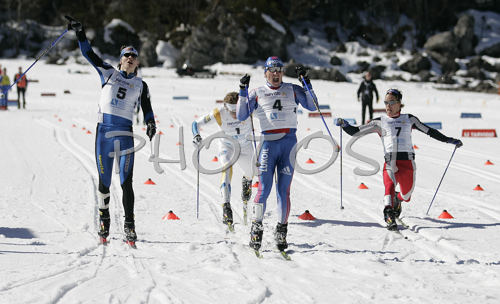 : Winner Ivan Ivanov of Russia (M), second placed Martti Jylhae of Finland (L) and third placed Eirik Saeves of Norway (R) sprinting in finals of Men Sprint race of Junior Nordic skiing World Championships in Tarvisio, Italy. Men Sprint race of Junior Nordic skiing World Championships in Tarvisio, Italy was held on 12th of March 2007 in Fusine, Italy. Due warm weather and lack of snow, cross country skiing races of Junior Nordic skiing World Championships 2007 were moved from Tarvisio, Italy to Fusine, Italy.