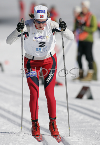 : Kari Vikhagen Gjeitnes of Norway skiing in qualifications for Women Under23 Sprint race of Junior Nordic skiing World Championships in Tarvisio, Italy. Qualifications for Women Sprint race of Junior Nordic skiing World Championships in Tarvisio, Italy were held on 13th of March 2007 in Fusine, Italy. Due warm weather and lack of snow, cross country skiing races of Junior Nordic skiing World Championships 2007 were moved from Tarvisio, Italy to Fusine, Italy.