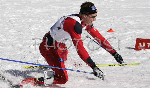 : Hans Petter Lykkja of Norway having problems and falling in semi finals of Men Under23 Sprint race of Junior Nordic skiing World Championships in Tarvisio, Italy. Men Sprint race of Junior Nordic skiing World Championships in Tarvisio, Italy was held on 13th of March 2007 in Fusine, Italy. Due warm weather and lack of snow, cross country skiing races of Junior Nordic skiing World Championships 2007 were moved from Tarvisio, Italy to Fusine, Italy.