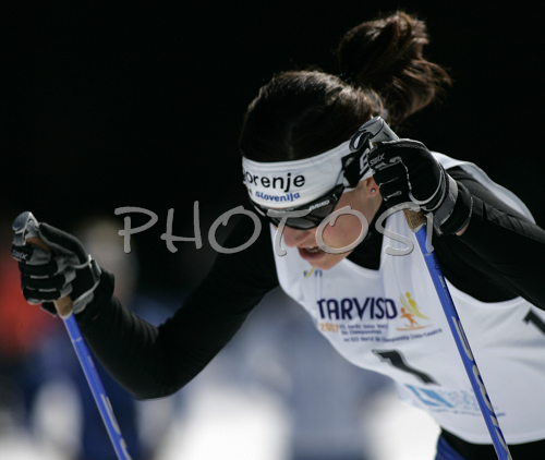 : Katja Visnar of Slovenia skiing in quarter finals of Women Under23 Sprint race of Junior Nordic skiing World Championships in Tarvisio, Italy. Women Sprint race of Junior Nordic skiing World Championships in Tarvisio, Italy was held on 13th of March 2007 in Fusine, Italy. Due warm weather and lack of snow, cross country skiing races of Junior Nordic skiing World Championships 2007 were moved from Tarvisio, Italy to Fusine, Italy.