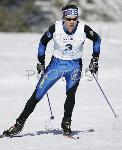 : Winner Martti Jylhae of Finland skiing in Men 10km freestyle race of Junior Nordic skiing World Championships in Tarvisio, Italy. Men 10km freestyle race of Junior Nordic skiing World Championships in Tarvisio, Italy was held on 14th of March 2007 in Fusine, Italy. Due warm weather and lack of snow, cross country skiing races of Junior Nordic skiing World Championships 2007 were moved from Tarvisio, Italy to Fusine, Italy.