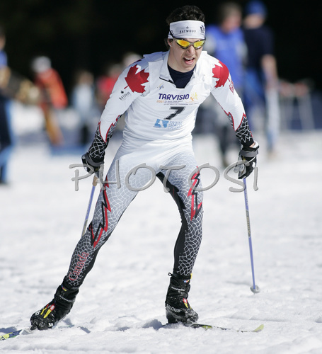 : Third placed Alex Harvey of Canada skiing in Men 10km freestyle race of Junior Nordic skiing World Championships in Tarvisio, Italy. Men 10km freestyle race of Junior Nordic skiing World Championships in Tarvisio, Italy was held on 14th of March 2007 in Fusine, Italy. Due warm weather and lack of snow, cross country skiing races of Junior Nordic skiing World Championships 2007 were moved from Tarvisio, Italy to Fusine, Italy.
