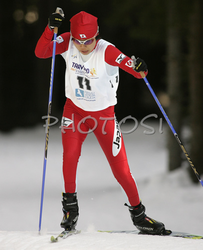 : Chie Maruyama of Japan skiing in Women 5km freestyle race of Junior Nordic skiing World Championships in Tarvisio, Italy. Women 5km freestyle race of Junior Nordic skiing World Championships in Tarvisio, Italy was held on 14th of March 2007 in Fusine, Italy. Due warm weather and lack of snow, cross country skiing races of Junior Nordic skiing World Championships 2007 were moved from Tarvisio, Italy to Fusine, Italy.