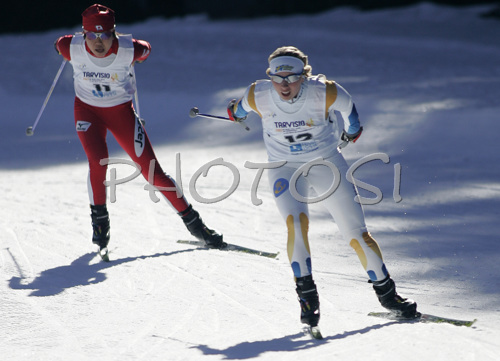 : Mia Eriksson of Sweden skiing in Women 5km freestyle race of Junior Nordic skiing World Championships in Tarvisio, Italy. Women 5km freestyle race of Junior Nordic skiing World Championships in Tarvisio, Italy was held on 14th of March 2007 in Fusine, Italy. Due warm weather and lack of snow, cross country skiing races of Junior Nordic skiing World Championships 2007 were moved from Tarvisio, Italy to Fusine, Italy.