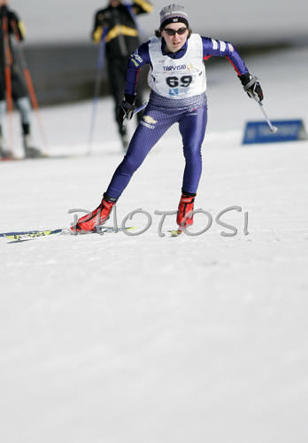 : Elisabeth Habermann of USA skiing in Women 5km freestyle race of Junior Nordic skiing World Championships in Tarvisio, Italy. Women 5km freestyle race of Junior Nordic skiing World Championships in Tarvisio, Italy was held on 14th of March 2007 in Fusine, Italy. Due warm weather and lack of snow, cross country skiing races of Junior Nordic skiing World Championships 2007 were moved from Tarvisio, Italy to Fusine, Italy.
