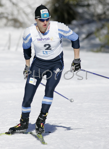 : Alexey Poltaranin of Kazahstan skiing in Men 10km freestyle race of Junior Nordic skiing World Championships in Tarvisio, Italy. Men 10km freestyle race of Junior Nordic skiing World Championships in Tarvisio, Italy was held on 14th of March 2007 in Fusine, Italy. Due warm weather and lack of snow, cross country skiing races of Junior Nordic skiing World Championships 2007 were moved from Tarvisio, Italy to Fusine, Italy.