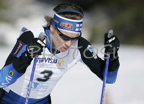 : Winner Martti Jylhae of Finland skiing in Men 10km freestyle race of Junior Nordic skiing World Championships in Tarvisio, Italy. Men 10km freestyle race of Junior Nordic skiing World Championships in Tarvisio, Italy was held on 14th of March 2007 in Fusine, Italy. Due warm weather and lack of snow, cross country skiing races of Junior Nordic skiing World Championships 2007 were moved from Tarvisio, Italy to Fusine, Italy.