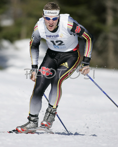 : Axel Schatz of Germany skiing in Men 10km freestyle race of Junior Nordic skiing World Championships in Tarvisio, Italy. Men 10km freestyle race of Junior Nordic skiing World Championships in Tarvisio, Italy was held on 14th of March 2007 in Fusine, Italy. Due warm weather and lack of snow, cross country skiing races of Junior Nordic skiing World Championships 2007 were moved from Tarvisio, Italy to Fusine, Italy.