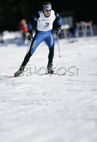 : Winner Martti Jylhae of Finland skiing in Men 10km freestyle race of Junior Nordic skiing World Championships in Tarvisio, Italy. Men 10km freestyle race of Junior Nordic skiing World Championships in Tarvisio, Italy was held on 14th of March 2007 in Fusine, Italy. Due warm weather and lack of snow, cross country skiing races of Junior Nordic skiing World Championships 2007 were moved from Tarvisio, Italy to Fusine, Italy.