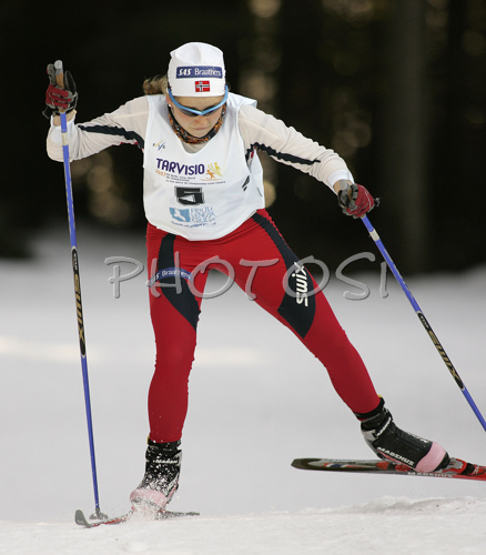 : Second placed Marthe Kristoffersen of Norway skiing in Women 5km freestyle race of Junior Nordic skiing World Championships in Tarvisio, Italy. Women 5km freestyle race of Junior Nordic skiing World Championships in Tarvisio, Italy was held on 14th of March 2007 in Fusine, Italy. Due warm weather and lack of snow, cross country skiing races of Junior Nordic skiing World Championships 2007 were moved from Tarvisio, Italy to Fusine, Italy.