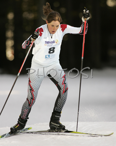 : 9th placed Brittany Webster of Canada skiing in Women 5km freestyle race of Junior Nordic skiing World Championships in Tarvisio, Italy. Women 5km freestyle race of Junior Nordic skiing World Championships in Tarvisio, Italy was held on 14th of March 2007 in Fusine, Italy. Due warm weather and lack of snow, cross country skiing races of Junior Nordic skiing World Championships 2007 were moved from Tarvisio, Italy to Fusine, Italy.