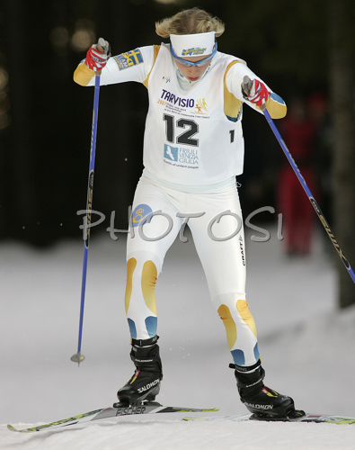 : 6th placed Mia Eriksson of Sweden skiing in Women 5km freestyle race of Junior Nordic skiing World Championships in Tarvisio, Italy. Women 5km freestyle race of Junior Nordic skiing World Championships in Tarvisio, Italy was held on 14th of March 2007 in Fusine, Italy. Due warm weather and lack of snow, cross country skiing races of Junior Nordic skiing World Championships 2007 were moved from Tarvisio, Italy to Fusine, Italy.