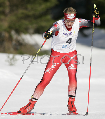: Winner Silvana Bucher of Switzerland skiing in Women 10km freestyle race of Under23 Nordic skiing World Championships in Tarvisio, Italy. Women 10km freestyle race of Junior Nordic skiing World Championships in Tarvisio, Italy was held on 15th of March 2007 in Fusine, Italy. Due warm weather and lack of snow, cross country skiing races of Junior Nordic skiing World Championships 2007 were moved from Tarvisio, Italy to Fusine, Italy.