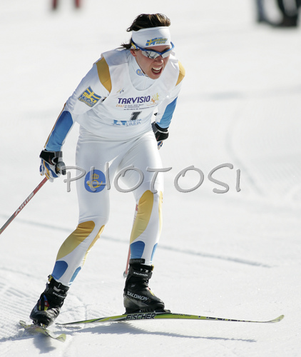 : Winner Charlotte Kalla of Sweden skiing in Women 5+5km pursuit race of Junior Nordic skiing World Championships in Tarvisio, Italy. Women 5+5km pursuit race of Junior Nordic skiing World Championships in Tarvisio, Italy was held on 16th of March 2007 in Fusine, Italy. Due warm weather and lack of snow, cross country skiing races of Junior Nordic skiing World Championships 2007 were moved from Tarvisio, Italy to Fusine, Italy.