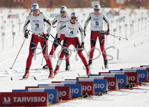 : Norwegian girls Astrid Jacobsen (L), Marte Monrad-Hansen (M), Marthe Kristoffersen (R) and Therese Johaug (back) coming to change their skis in Women 5+5km pursuit race of Junior Nordic skiing World Championships in Tarvisio, Italy. Women 5+5km pursuit race of Junior Nordic skiing World Championships in Tarvisio, Italy was held on 16th of March 2007 in Fusine, Italy. Due warm weather and lack of snow, cross country skiing races of Junior Nordic skiing World Championships 2007 were moved from Tarvisio, Italy to Fusine, Italy.Photo by: Primoz Jeroncic/PhotoSI