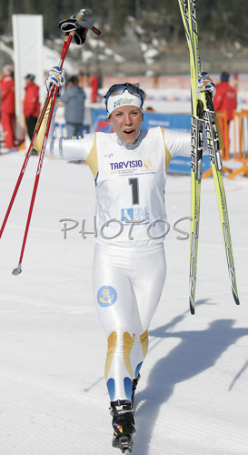 : Winner Charlotte Kalla of Sweden celebrating her victory and World Champion title in Women 5+5km pursuit race of Junior Nordic skiing World Championships in Tarvisio, Italy. Women 5+5km pursuit race of Junior Nordic skiing World Championships in Tarvisio, Italy was held on 16th of March 2007 in Fusine, Italy. Due warm weather and lack of snow, cross country skiing races of Junior Nordic skiing World Championships 2007 were moved from Tarvisio, Italy to Fusine, Italy.