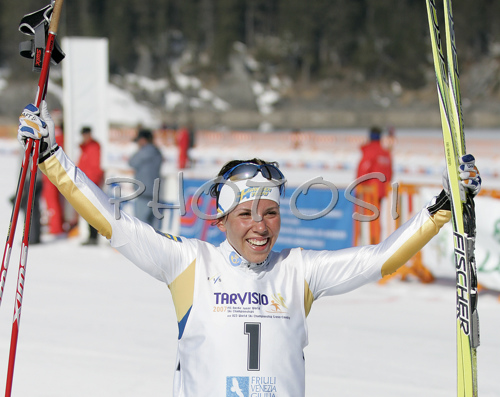 : Winner Charlotte Kalla of Sweden celebrating her victory and World Champion title in Women 5+5km pursuit race of Junior Nordic skiing World Championships in Tarvisio, Italy. Women 5+5km pursuit race of Junior Nordic skiing World Championships in Tarvisio, Italy was held on 16th of March 2007 in Fusine, Italy. Due warm weather and lack of snow, cross country skiing races of Junior Nordic skiing World Championships 2007 were moved from Tarvisio, Italy to Fusine, Italy.
