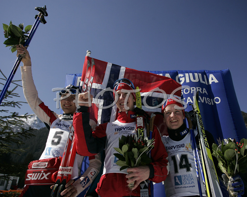 : Winner Eirik Kurland Olsen of Norway (M), second placed Ondrej Horyna of Czech (L) and third placed Sjur Roethe of Norway of Norway (R) celebrating their medals won in Men 10+10km pursuit race of Junior Nordic skiing World Championships in Tarvisio, Italy. Men 10+10km pursuit race of Junior Nordic skiing World Championships in Tarvisio, Italy was held on 16th of March 2007 in Fusine, Italy. Due warm weather and lack of snow, cross country skiing races of Junior Nordic skiing World Championships 2007 were moved from Tarvisio, Italy to Fusine, Italy.