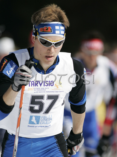 : Matti Kylmaelae of Finland skiing in Men 15+15km pursuit race of Under23 Nordic skiing World Championships in Tarvisio, Italy. Men 15+15km pursuit race of Junior Nordic skiing World Championships in Tarvisio, Italy was held on 17th of March 2007 in Fusine, Italy. Due warm weather and lack of snow, cross country skiing races of Junior Nordic skiing World Championships 2007 were moved from Tarvisio, Italy to Fusine, Italy.