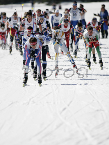 : Skiers competing in Men 15+15km pursuit race of Under23 Nordic skiing World Championships in Tarvisio, Italy. Men 15+15km pursuit race of Junior Nordic skiing World Championships in Tarvisio, Italy was held on 17th of March 2007 in Fusine, Italy. Due warm weather and lack of snow, cross country skiing races of Junior Nordic skiing World Championships 2007 were moved from Tarvisio, Italy to Fusine, Italy.