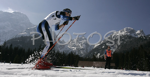 : Matti Kylmaelae of Finland skiing in Men 15+15km pursuit race of Under23 Nordic skiing World Championships in Tarvisio, Italy. Men 15+15km pursuit race of Junior Nordic skiing World Championships in Tarvisio, Italy was held on 17th of March 2007 in Fusine, Italy. Due warm weather and lack of snow, cross country skiing races of Junior Nordic skiing World Championships 2007 were moved from Tarvisio, Italy to Fusine, Italy.