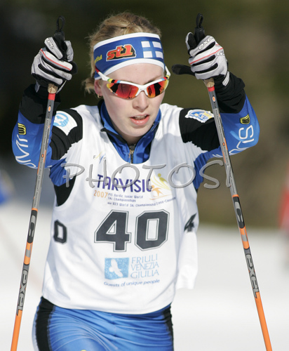 : Satu Pirttiniemi of Finland skiing in Women 7.5+7.5km pursuit race of Under23 Nordic skiing World Championships in Tarvisio, Italy. Women 7.5+7.5km pursuit race of Junior Nordic skiing World Championships in Tarvisio, Italy was held on 17th of March 2007 in Fusine, Italy. Due warm weather and lack of snow, cross country skiing races of Junior Nordic skiing World Championships 2007 were moved from Tarvisio, Italy to Fusine, Italy.