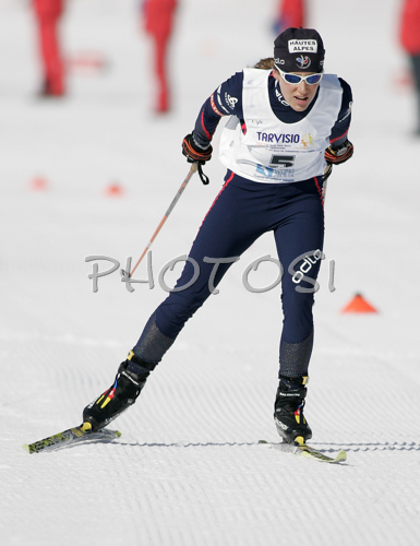 : Second placed Coraline Hugue of France skiing in Women 7.5+7.5km pursuit race of Under23 Nordic skiing World Championships in Tarvisio, Italy. Women 7.5+7.5km pursuit race of Junior Nordic skiing World Championships in Tarvisio, Italy was held on 17th of March 2007 in Fusine, Italy. Due warm weather and lack of snow, cross country skiing races of Junior Nordic skiing World Championships 2007 were moved from Tarvisio, Italy to Fusine, Italy.