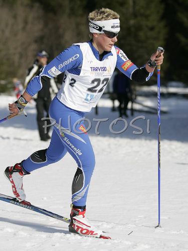 : Barbara Jezersek of Slovenia skiing in Women 7.5+7.5km pursuit race of Under23 Nordic skiing World Championships in Tarvisio, Italy. Women 7.5+7.5km pursuit race of Junior Nordic skiing World Championships in Tarvisio, Italy was held on 17th of March 2007 in Fusine, Italy. Due warm weather and lack of snow, cross country skiing races of Junior Nordic skiing World Championships 2007 were moved from Tarvisio, Italy to Fusine, Italy.