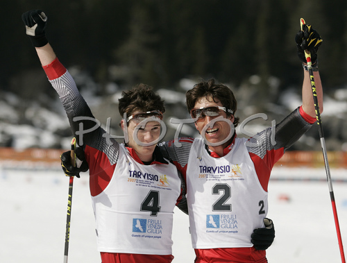 Tarvisio ,Italy - 17.03.2007 : Winner Dario Cologna of Switzerland (L) celebrating his victory with his teammate Curdin Perl (R) in finish area of Men 15+15km pursuit race of Under23 Nordic skiing World Championships in Tarvisio, Italy. Men 15+15km pursuit race of Junior Nordic skiing World Championships in Tarvisio, Italy was held on 17th of March 2007 in Fusine, Italy. Due warm weather and lack of snow, cross country skiing races of Junior Nordic skiing World Championships 2007 were moved from Tarvisio, Italy to Fusine, Italy. Photo by: Primoz Jeroncic/PhotoSI