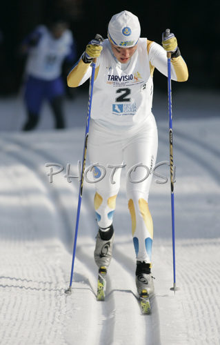 : Eva Svensson of Sweden skiing in Women 4x3.3km relay race of Junior Nordic skiing World Championships in Tarvisio, Italy. Women 4x3.3km relay race of Junior Nordic skiing World Championships in Tarvisio, Italy was held on 18th of March 2007 in Fusine, Italy. Due warm weather and lack of snow, cross country skiing races of Junior Nordic skiing World Championships 2007 were moved from Tarvisio, Italy to Fusine, Italy.
