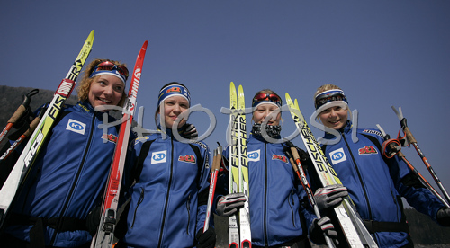 : Girls of Finnish relay, Satu Annila, Kerttu Niskanen, Anne Kyllonen and Mari Laukkanen celebrating their bronze medal won in Women 4x3.3km relay race of Junior Nordic skiing World Championships in Tarvisio, Italy. Women 4x3.3km relay race of Junior Nordic skiing World Championships in Tarvisio, Italy was held on 18th of March 2007 in Fusine, Italy. Due warm weather and lack of snow, cross country skiing races of Junior Nordic skiing World Championships 2007 were moved from Tarvisio, Italy to Fusine, Italy.