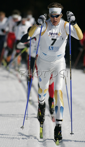 : Jesper Modin of Sweden skiing in Men 4x5km relay race of Junior Nordic skiing World Championships in Tarvisio, Italy. Men 4x5km relay race of Junior Nordic skiing World Championships in Tarvisio, Italy was held on 18th of March 2007 in Fusine, Italy. Due warm weather and lack of snow, cross country skiing races of Junior Nordic skiing World Championships 2007 were moved from Tarvisio, Italy to Fusine, Italy.