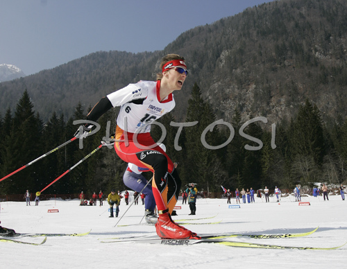 : Michael Reiter of Austria skiing in Men 4x5km relay race of Junior Nordic skiing World Championships in Tarvisio, Italy. Men 4x5km relay race of Junior Nordic skiing World Championships in Tarvisio, Italy was held on 18th of March 2007 in Fusine, Italy. Due warm weather and lack of snow, cross country skiing races of Junior Nordic skiing World Championships 2007 were moved from Tarvisio, Italy to Fusine, Italy.